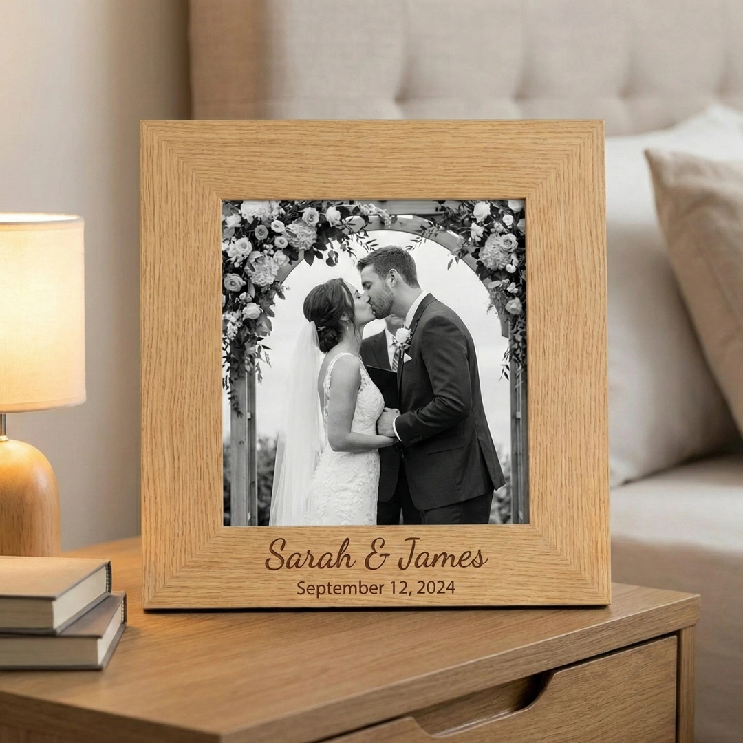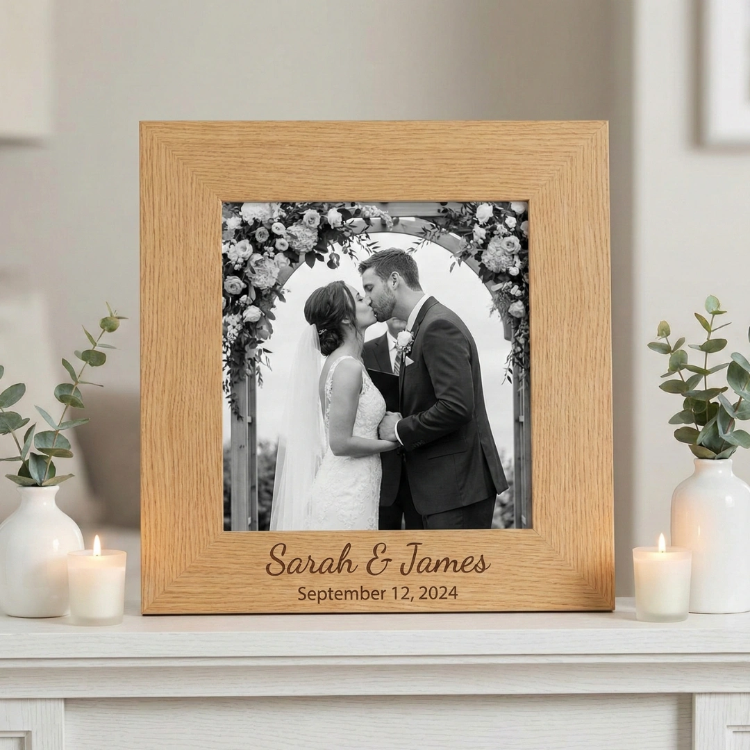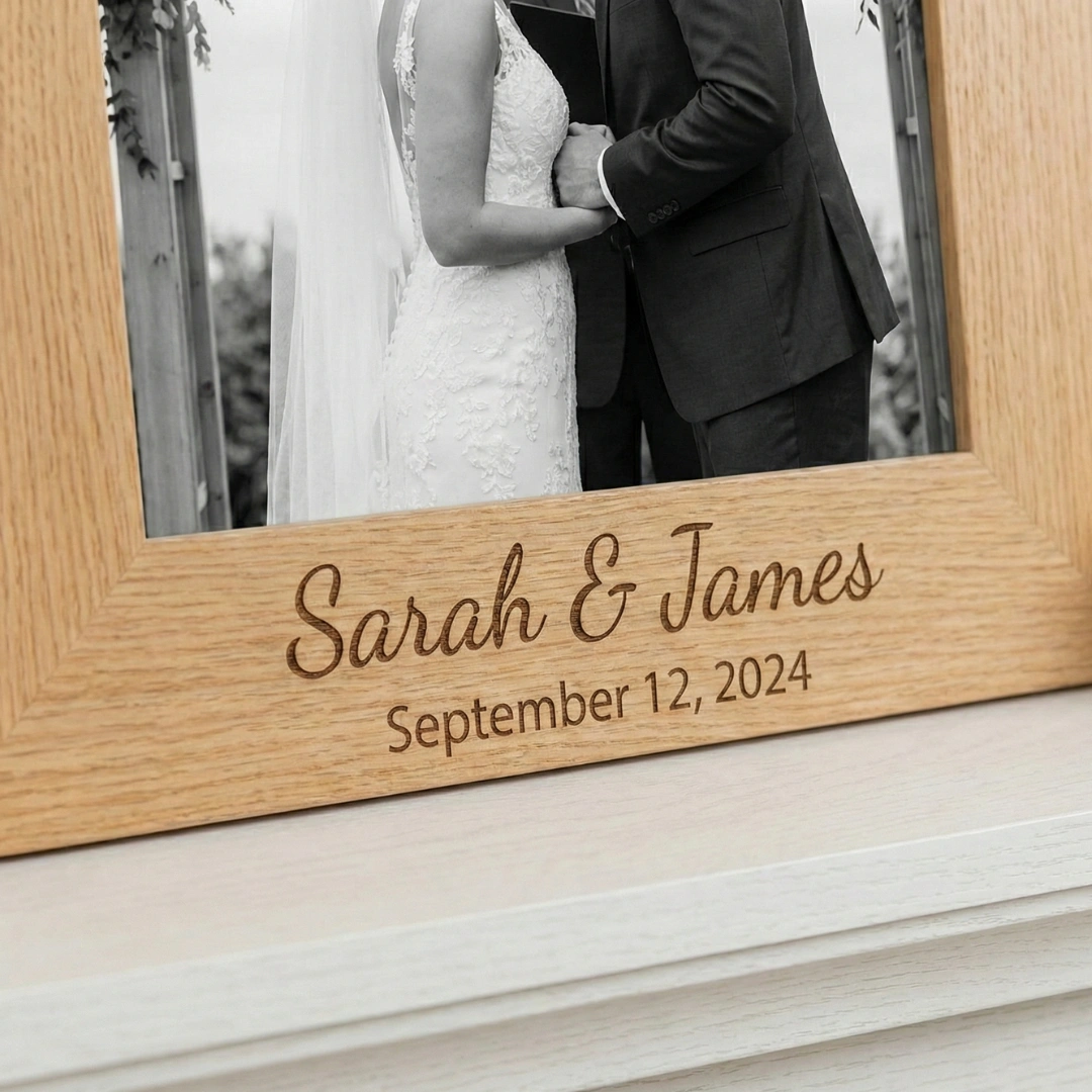 This customized wedding photo frame beautifully displays couple names and wedding dates. A perfect keepsake that blends emotion and elegance.