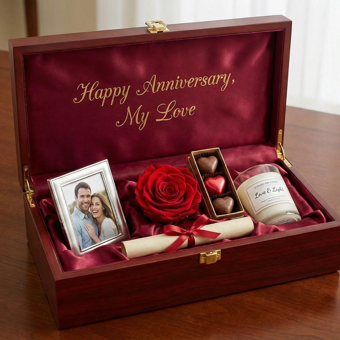 This anniversary gift box includes romantic elements such as scented candles, chocolates, and a heartfelt note. Ideal for surprising your partner and celebrating love in a meaningful way.